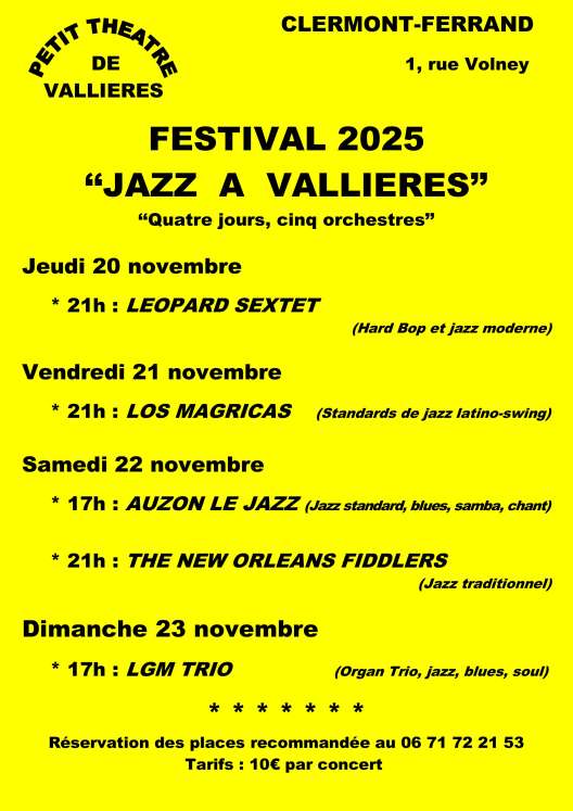 Une promenade à travers le jazz et la musique improvisée de toutes les époques et de tous les pays, proposée par des orchestres régionaux dexcellente qualité qui vous entraîneront dans des rythmes standards, latins, new orleans, blues, swing, bossa, middle, manouche, salsa, tango, chant ... jusquau bout de la nuit si affinités ...
